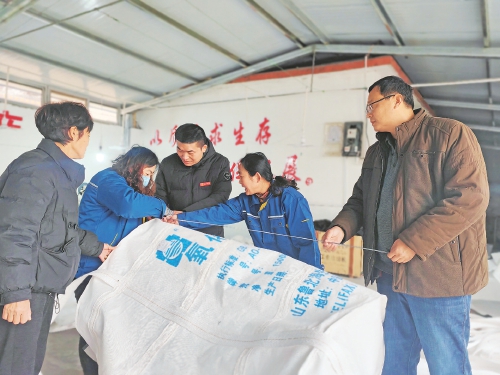 12月12日,天刚蒙蒙亮,平阴县孔村镇前套村52岁的村民解红利裹紧棉衣走出家门。步行约两三分钟,就到了位于村委会大院里的吨袋加工厂,“嚯,你们比我还早。”解红利打着招呼,孔村镇前套村党支部书记王桂莲迎面走来。