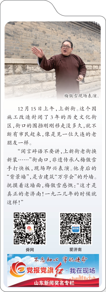 当天,市中区文化和旅游局局长田霖带着记者“city walk”,她坚持要把起点定在北口。“上新街的名字由来,与它的地势有关,自北向南步步上坡,通向‘新建门’,所以叫‘上新街’。”一路上,从书画大家关友声到京剧大师方荣翔,再到一代跤王马清宗,田霖将这些民居古建筑里的故事娓娓道来。