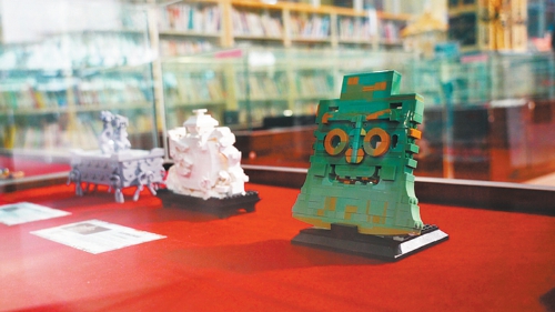 亚醜钺旁边还有好几件“文物”,出土于明鲁荒王朱檀墓的镶宝石玉金带饰,又名“鲁王之宝”,设计师用乐高重塑了浑厚的金色光泽和璀璨夺目的宝石;而用乐高拼成的“西周裸人铜方奁”,颇有原作的神韵和趣味。