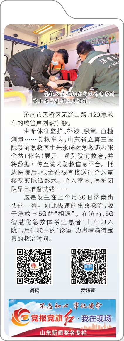 济南市急救中心统筹布局,与山东省立第三医院通力合作,研发院前院后告知系统,打破信息壁垒,整合多方医疗资源,打造了5G智慧化急救体系。山东省立第三医院作为济南市首家试点医疗机构,首创省立三院院前急救5G专网项目、院内His系统,完善急救网络布局,率先将5G先进的信息化技术深度融入医疗急救,成功探索了5G急救指挥平台等应用,为急危重症患者抢救争取了宝贵时间。