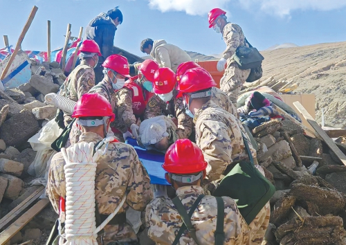 1月7日,救援人员在定日县扎村转移伤员。