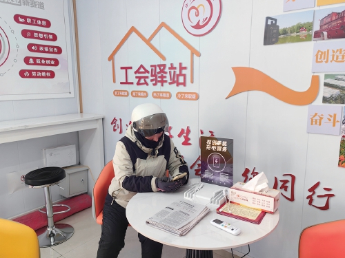 小辛工会驿站位于城区主干道工业北路的南侧,紧邻鑫恒广场和裕辛南苑小区入口,这间30多平方米的工会驿站格外醒目。在这里,户外劳动者无论忙到多晚,“刷脸”就能进站歇脚减压。外卖骑手张林在门口摄像头前露个脸,“嘀”的一声,大门应声而开。“我每天要跑50多单,手机耗电快,接单的间隙会到驿站喝口水,给手机充充电。”他开心地说,“现在有了24小时服务的驿站,晚上也能进来休息和充电,太好了!”