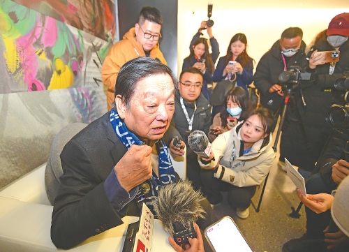 韩美林接受媒体采访。(济南日报·爱济南记者 崔健 摄)