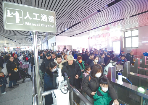 1月12日,旅客在济南站排队乘车。目前,济南站客流以放假返乡学生为主。