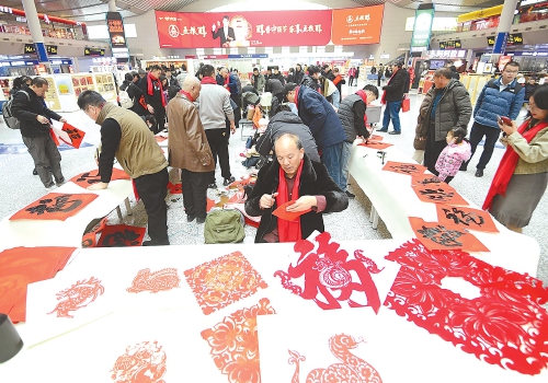 1月14日,在济南西站二楼候车大厅,书画名家现场挥毫泼墨,为旅客写春联、赠福字,传递迎新纳福美好祝愿。