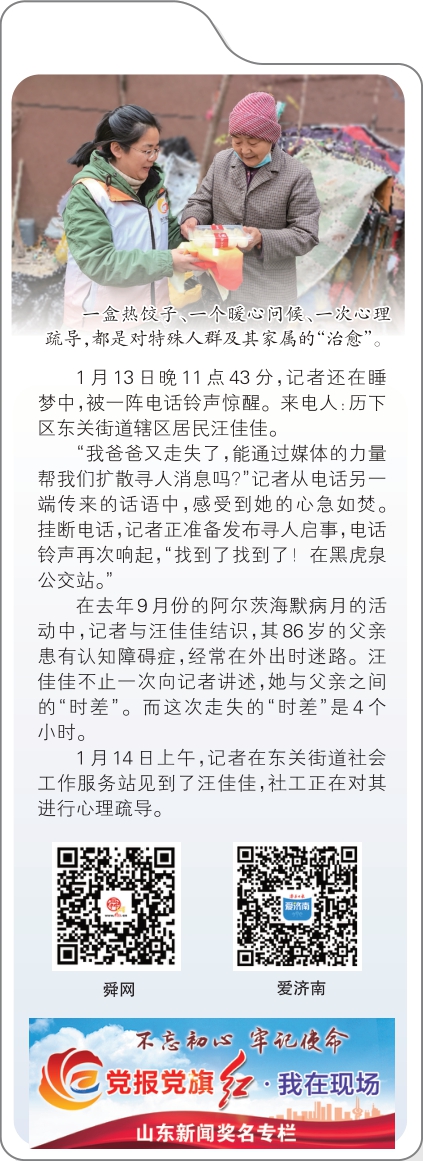 东关街道社会工作服务站站长鲁亚丽轻拍汪佳佳的后背,不断安抚着,“人找到了就好,咱先带着老人回家。”待父女俩情绪平稳后,救援人员和社工将他们送回了家。