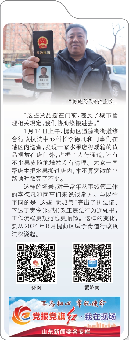 “要是从前,我们对私拉泔水的那对父子只能劝阻不能处罚。”街道综合行政执法中心工作人员刘杰说,自己是在城管科工作了七八年的“老城管”,最了解“权力有限、责任无限”的无奈和尴尬。好在,2024年8月,槐荫区开展了赋予街道行政执法权试点工作,街道成立综合行政执法中心,数十项常见行政处罚事项“放权”到了街道,“老城管”们终于有了行政执法权。“从前只能劝说不能处罚,工作不好开展。现在亮证执法,有底气!”