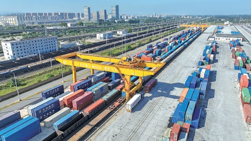 在济南董家铁路国际货运中心,满是待外运的集装箱。