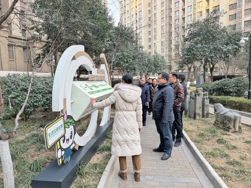 观摩人员到小区参观垃圾分类设施建设。
