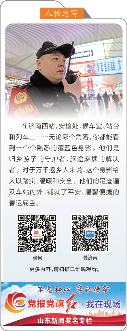 早上9点钟,刚刚和前一班同事完成交接的刘红星,与同事们列队走进站内。这支来自济南西站派出所的巡查力量,将负责接下来24小时内整个车站的安全保障工作。记者跟随他们的脚步,观察和记录着他们的春运日常。