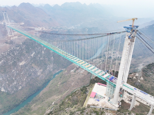 1月17日,花江峡谷大桥成功合龙(无人机照片)。当日,在建世界第一高桥——贵州六安高速公路花江峡谷大桥成功合龙,为今年通车运营打下坚实基础。项目资料显示,大桥为钢桁梁悬索桥,全长2890米,其中主桥跨径1420米,桥面至水面高度625米。建成后,会成为新的世界第一高桥、世界第一的山区跨径桥梁。 (新华社发)
