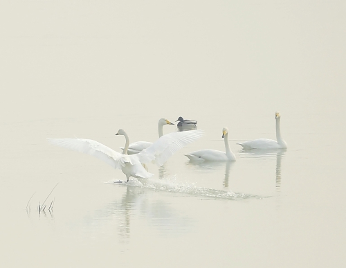 1月23日,在济南黄河北岸的鹊山水库沉砂池,百余只在济越冬的大天鹅在晨雾中或翱翔天际,或在水中游弋觅食,阵阵悠扬而绵长的叫声如同天籁之音回荡在宁静的水面上,曼妙的身姿不时引得摄影师的快门声响起,在春节即将到来之际为市民奉上了一曲绝美的冬日恋歌,成为泉城冬日里一幅优美的生态画卷。(济南日报·爱济南记者 崔健 摄)