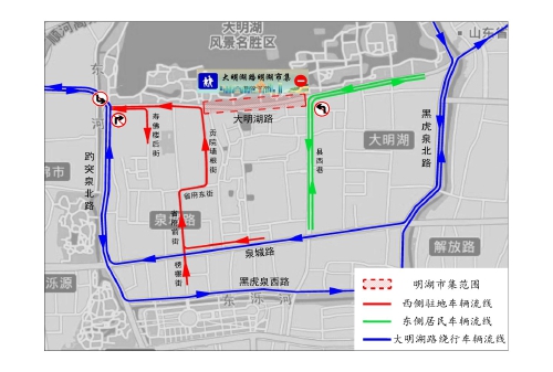 为确保明湖市集正常运行,春节期间,大明湖路周边交通组织要进行临时调整,在明湖市集举办期间,大明湖路(县西巷-贡院墙根街段),禁止所有机动车和非机动车通行,仅允许行人步行。