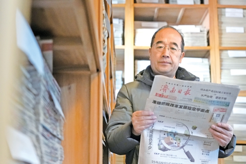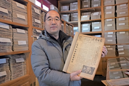赵鹏展示上世纪六十年代已泛黄的《济南日报》。