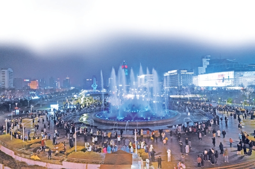 泉城广场音乐喷泉灯光秀引得众多市民游客驻足。(王刚 摄)
