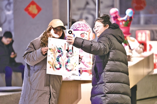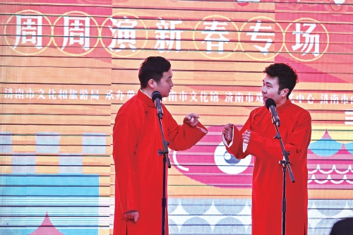 2月2日,在济南韩美林艺术馆内,琳琅满目的文创产品“圈粉”了众多年轻游客。馆内上百种印有韩美林画作的笔记本、明信片,以及造型独特的雕塑摆件、艺术徽章等特色文创产品,颇受游客欢迎。在济南市文化馆一楼大厅,相声、快板书、山东琴书等各类曲艺节目轮番登场,现场气氛热烈。春节期间,济南市文化馆通过举办丰富多彩的文化惠民活动,让市民游客欢欢喜喜过大年。