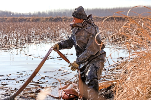 挖藕工具是一个水泵。挖藕前要先砸冰,把冰面砸开才能下水。