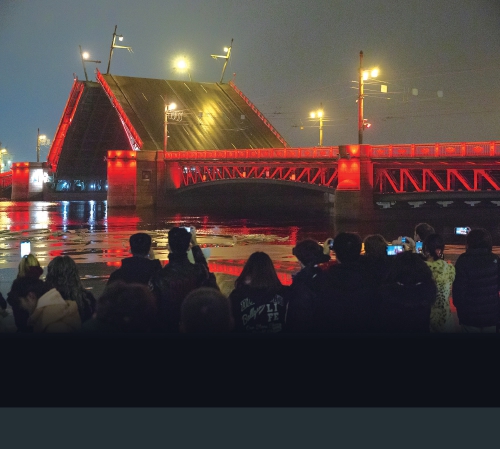 1月29日凌晨,在俄罗斯圣彼得堡,人们在涅瓦河畔观看亮起“中国红”的冬宫桥开桥。(新华社发)