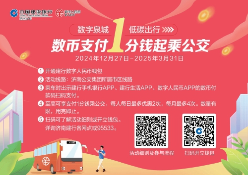 据了解,为积极响应济南市政府印发的《济南市数字人民币试点工作实施方案》,持续推进济南市数字人民币公交出行场景应用扩面,引导广大泉城居民建立使用数字人民币、绿色低碳出行的生活方式,自2024年12月份起,建行济南分行与济南公交集团联合开展“数字泉城 低碳出行”——数字人民币一分钱乘公交活动,这是济南市在交通出行领域落地的首个交通出行数字人民币支付场景。数据显示,截至目前,该活动参与人数达53万余人次。