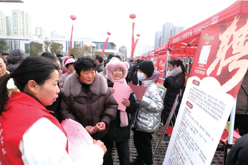 2月5日,在安徽省亳州市蒙城县庄周街道,求职者在招聘会上了解招聘信息。