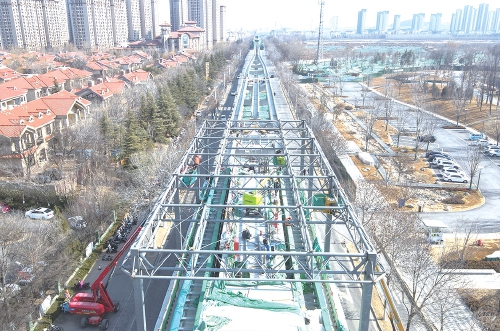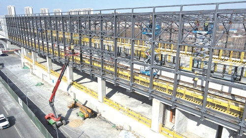 2月10日,在济南轨道交通8号线一期工程建设现场,地上车站正在进行雨棚钢结构安装(上图)。按照计划,该项目力争2月底前完成全线钢结构雨棚施工,为接触网架设按计划推进奠定坚实基础。据了解,目前轨交8号线车站已全部封顶,转入装饰装修、机电设备安装阶段;铺轨施工完成接近90%;接触网支柱安装接近尾声,车辆段建设正加快推进。下一步,各参建单位将进一步增加人员、设备投入,向着全线轨通、电通的目标加速迈进,确保2025年年底建成通车。