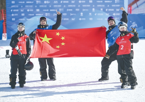2月10日,中国选手张小楠、杨文龙、姜鑫杰与熊诗芮(从左至右)在比赛后庆祝。(新华社发)