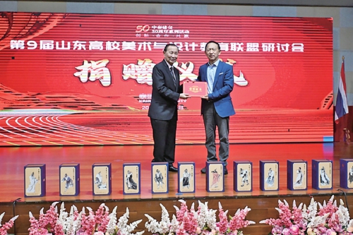 肖南昌日前随山东高校美术与设计教育联盟到访泰国,参加中泰建交50周年系列活动——第九届山东高校美术与设计教育联盟研讨会,并出席“齐鲁十二圣贤酒”捐赠仪式。泰国教育部前部长、格乐大学校长为肖南昌现场颁发“铭志善举”捐赠证书,承诺全套“齐鲁十二圣贤酒”文创产品将被该校艺术馆永久收藏,全部用于公益事业教学。