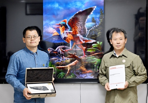 2月11日,古脊椎所王敏研究员(左)与福建地调院教授级高工陈润生在福建地调院合影。近日,中国科学院古脊椎动物与古人类研究所王敏团队和福建省地质调查研究院团队联合对新发现鸟类化石——“政和八闽鸟”的研究,揭示了现代鸟类的体型结构在侏罗纪晚期(距今1.5亿年)就已经出现,将以尾综骨为代表的重要特征的出现时间提早了近2000万年。相关研究成果于北京时间2月13日在《自然》杂志上发表。 (新华社发)