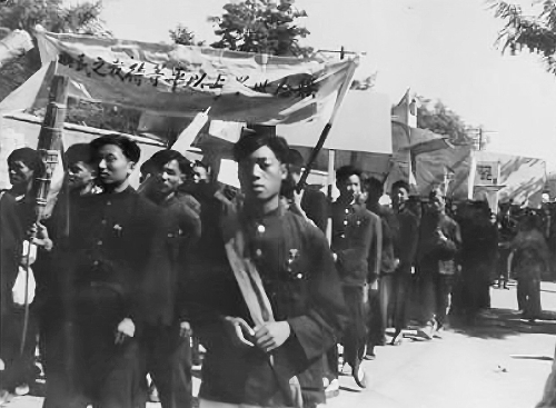 游行队伍经过主席台走出会场后,兵分四路进发。三万余青年学生组成的纵队为一路,他们青春洋溢、活力四射,欢声笑语回荡在队伍之中;五万余机关干部、驻地部队代表组成的纵队为一路,步伐整齐、纪律严明,展现出严谨的作风与昂扬的斗志;五万余工人组成的纵队为一路,他们带着工人阶级的质朴与坚韧,彰显着新中国建设的主力军力量;六万余市民及社会各界代表组成的纵队为一路,激昂的口号声响彻云霄,他们眼神中闪烁着希望与自豪,那是对新生活的向往,对未来的坚定信念。四路队伍分别按规定路线穿越市区,向东行进。沿途,广大市民群众夹道欢迎,用最热烈的掌声和欢呼声表达着对游行队伍的支持与祝福。不少人家还在门前摆上桌凳,备下开水,以最质朴的方式为游行的人们送上一份温暖与关怀。