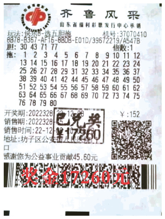 “潍坊福彩”订阅号二维码 也许你是刚接触快乐8的新手,也许你对快乐8感兴趣但又不知道从何玩起,其实快乐8作为一种幸运,时刻存在于我们的身边。 好心态带来好运气, 坊子彩友喜中17260元 2022年12月9日一早,心情激动的郭先生(化姓)来到了坊子区37070410号福彩站。原来,在2022年12月8日,快乐8游戏第2022328期中,他以一张“选五四胆全拖”票中得奖金17260元。 当天,郭先生来到福彩站,在按照自己的习惯将平时各种玩法尝试了一番后,感觉似乎还不太“稳妥”,便决定选用“选五四胆全拖”的方式进行购彩。这次,他采用的是“幸运号码”对照号码走势的方式进行胆码筛选,片刻时间胆码就确定出来了。当晚开奖过后,郭先生发现自己选择的4个胆码全部命中,次日,郭先生就到站点办理了兑奖。 兑奖时,郭先生坦言,自己是快乐8游戏的爱好者,该游戏上市初始,因为其玩法多样且趣味性强,所以对其一直情有独钟,每期都会打上几注,号码皆是自选,而且命中率也很高,时常收获幸运。站上的彩友都很佩服郭先生的选号能力,在谈及是否有投注“窍门”时,郭先生说:“我能中奖纯凭运气,主要是有个好心态,再就是坚持,始终相信早中晚中早晚会中,把购彩当做一种娱乐方式,切莫孤注一掷。” 好事成双, 两彩站彩友齐中快乐8大奖 快乐8“选五四胆全拖”中奖的概率比较高,但是两个福彩站上彩友同期中奖,中奖号码及选号方式竟也完全相同的情况你听说过吗? 2022年12月10日,安丘市37078431号福彩站上彩友中得快乐8“选五四胆全拖”奖金34520元。同期,安丘市37079436号福彩站上彩友同样中得快乐8“选五四胆全拖”奖金34520元。值得一提的是,在这两个福彩站中奖的彩友所选的号码都是相同的,胆码都是“3、6、24、29”。 据两名彩站销售员介绍,中奖彩友都是站上的老朋友,刚开始玩彩时都没什么经验,后来经常和销售员以及站上彩友们讨论、研究快乐8的玩法和号码走势,通过对比中奖概率和中奖奖金,最后他们都选用了中奖概率相对较高的“选五四胆全拖”玩法。之前他们只中过2胆、3胆,这次功夫不负有心人,最终夺得幸运,看来,玩彩没有最好的方法,只有找到适合自己的投注方式才是收获幸运的关键。 (潍坊福彩 林浩 张传飞)