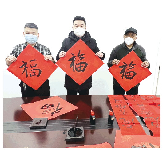 1月4日下午,潍城区城关街道翠竹园社区居民单约翰(上图右)、庄洪昌(上图左)来到居委会的新时代文明实践室写“福”字和春联。一副副对联和一张张“福”字写好以后,单约翰和庄洪昌交到社区工作人员手中。工作人员接过对联,贴在大门的两侧,随后带着“福”字和对联,前往居民家中送祝福。 潍坊日报社全媒体记者 张静