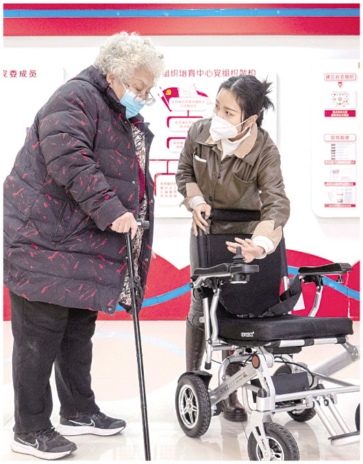 1月5日下午,工作人员向纪金霞(左)讲解电动轮椅的使用方法。当日,市民政局、市智慧养老服务中心联合举办“寒冬送温暖,让爱永传递——关爱老年志愿者”爱心捐赠活动,市民熟知的“最美志愿者”纪金霞获赠电动轮椅及大米、面粉等生活用品。据了解,70岁的纪金霞近期因腰椎间盘突出、椎管狭窄导致行走困难。 通讯员 杨伟林