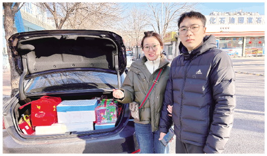 35岁的韩宇是地地道道的潍坊人,与丈夫结婚后在江苏省常州市定居。由于两地相隔甚远,她每年和父母团聚的时间很少,每次回来总感觉相聚的时光很短暂,转眼就要返程了。“我们一家三口是农历正月初二回的潍坊。这几天我妈一直忙着张罗,亲手做好了香肠、丸子,买了鱼、咸蟹子和孩子爱吃的零食。看到被塞满的后备箱,我心里有些不舍,更多的是感动。”韩宇说。