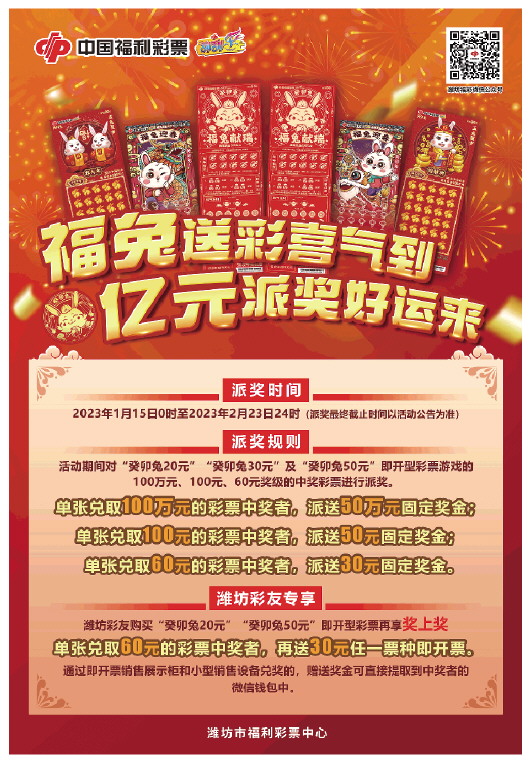 为回馈我市广大彩友,活动期间,潍坊彩友购买“癸卯兔20元”、“癸卯兔50元”再享奖上奖,单张兑取60元的彩票中奖者,再送30元任一票种即开票。通过即开票销售展示柜和小型销售设备兑奖的,赠送奖金可直接提取到中奖者的微信钱包中。