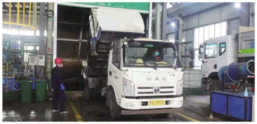 在潍坊市厨余废弃物处理厂,工作人员对厨余废弃物进行卸车。