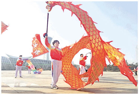 八字绕环、平旋平绕、螺旋缠绕……跟随着磅礴大气的中国风乐曲,队员们自如地变换动作,时而“昂首啸天”,时而“盘旋绕柱”。队员们在王艳莲的引导下,不断变换造型,实现了速度、力度、幅度三者合一,风姿尽显。“舞龙不仅丰富了我们的休闲娱乐生活,而且能修养身心,肩颈腰腿都能得到锻炼,每次舞龙后都感觉浑身舒畅。”队员张建国说。