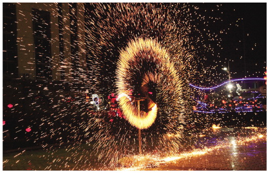 1月30日晚7时许,记者在位于昌乐县城东4公里的昌乐老爷车主题公园看到,非遗绝技“打铁花”在这里上演。只见2个熔炉分别喷出3米多高的火焰,4名艺人从熔炉中取出1600℃高温的炽热铁液迅速洒向天空。顿时,铁花四溅,犹如天女散花(右图)。当晚的表演吸引了上千名观众观看,大家惊叹不已,直呼过瘾。