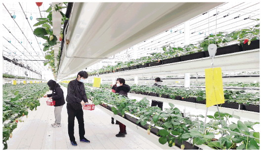 记者在现场看到,高架上一排排草莓苗长势喜人,绿油油的叶子下面点缀着一颗颗红色、白色果实,鲜嫩欲滴,整个温室内香气宜人,不少游客正在体验采摘草莓的乐趣。