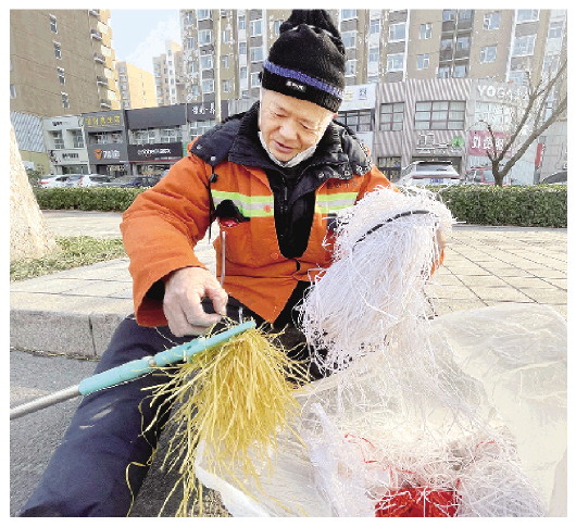 2月1日,记者在高新区卧龙东街与蓉花路交叉口附近看到,环卫工人李德华正在路边细心地制作“清扫神器”。一个废旧编织袋,在李德华手中被“抽丝剥茧”,撕成一缕缕的丝,然后绑在废旧拖把的骨架上,制作成了适用于路面狭小缝隙清扫的新“装备”。 潍坊日报社全媒体记者 张驰