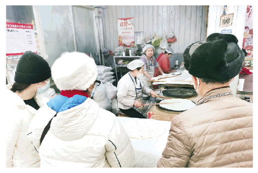 本报讯(潍坊日报社全媒体记者 刘蒙亮)2月6日一大早,高新区玄家朱茂集贸市场一家手擀饼店前围满了顾客(上图),有来买饼的、有来学习面饼加工技术的、有来应聘打工的。这家不大的店铺凭借传统手工工艺,加工出了特色面饼,生意一直很好。