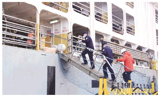 潍坊出入境边防检查站的民警上船检查。