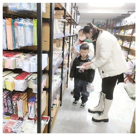市民带着孩子在文具店选购文具。