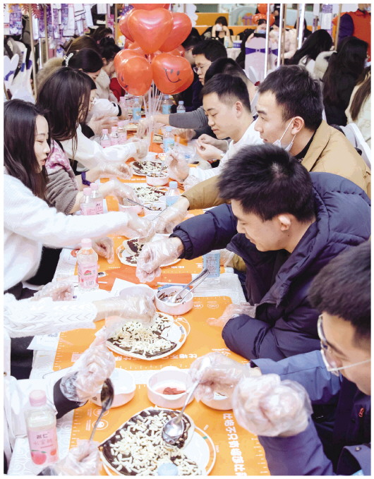 2月14日晚,在城区东风东街与新华路交叉口附近的潍坊印象汇,青年男女正在参加公益相亲活动。当晚,由潍坊团市委、市青联指导,奎文团区委等主办的2023年第1期全市单身青年联谊活动暨奎文区“青春有约·爱在奎文”青年联谊会在这里举行,来自机关、学校、医疗机构和部分企业近百位单身青年参加。青年男女通过自我介绍、趣味游戏、才艺展示等环节寻找意中人。 潍坊日报社全媒体记者 张驰