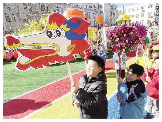 2月20日,在奎文区北海路街道胡西社区,小朋友们展示自制的“环保龙”。当日,一场“自制‘环保龙’ 喜迎二月二”的活动在胡西社区举行,小朋友们用废旧纸壳、彩带、易拉罐等材料制作了“环保龙”,迎接农历二月二的到来,在优秀传统文化的熏陶中快乐健康成长。 潍坊日报社全媒体记者 张驰