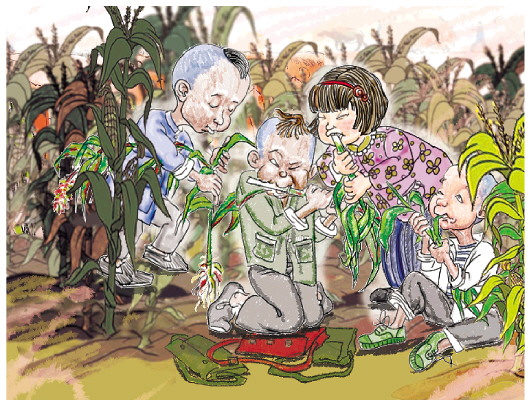 小学生们悄悄溜进玉米地的深处,啃玉米秸。