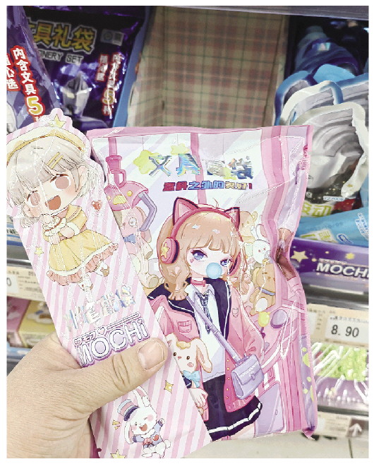 随后,记者又来到城区福寿东街一家超市内看到,文具盲盒摆放在销售区较显眼的位置。文具盲盒中性笔每支价格为4.9元、6.9元、10.9元不等,除了中性笔外,还有文具套装,套装里有4至5种文具,价格为17.9元、27.9元、39.9元不等。记者还发现,这些“文具盲盒”包装多样,“意料之外的美好”“内含文具随心选”等字眼更是吸引学生的目光。