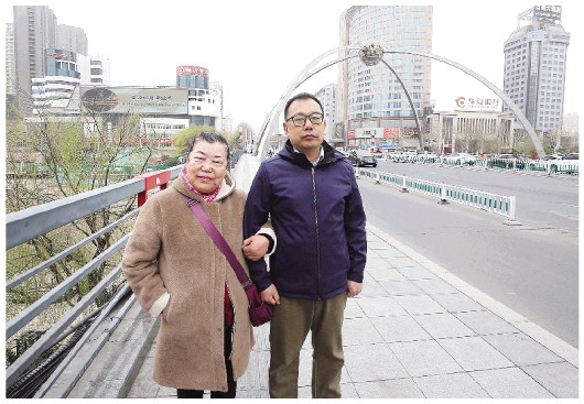 李东升(右)与他的母亲李玉兰在亚星桥上合影留念。