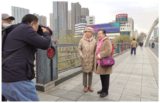记者张驰为吴凤荣和李玉兰(右)拍照留念。