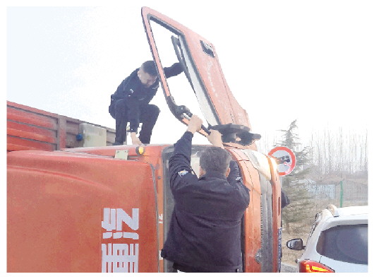 本报讯(潍坊日报社全媒体记者 张益阁 通讯员 丁虹羽)3月8日,诸城市龙都街道涓河大桥发生一起交通事故,一辆货车在行驶途中为避让一辆轿车紧急制动导致侧翻,驾驶员被困。诸城市公安局吕标派出所民警、辅警在出警返回途中恰好经过此处,立即对被困司机展开救援,并顺利将其救出。