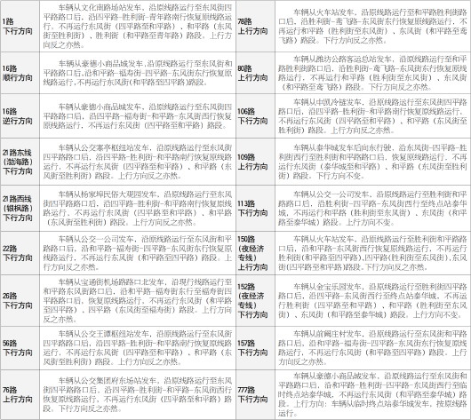 本报讯(潍坊日报社全媒体记者 王瑗)受东风街(和平路至白浪河桥东72米处)路段封闭施工影响,自封闭之日起,潍坊公交集团对受影响的1路、16路、21路东线(渤海路)、21路西线(银枫路)、22路、26路、56路、76路、78路、80路、106路、109路、113路、150路、152路、157路、777路共17条公交线路局部走向临时调整。